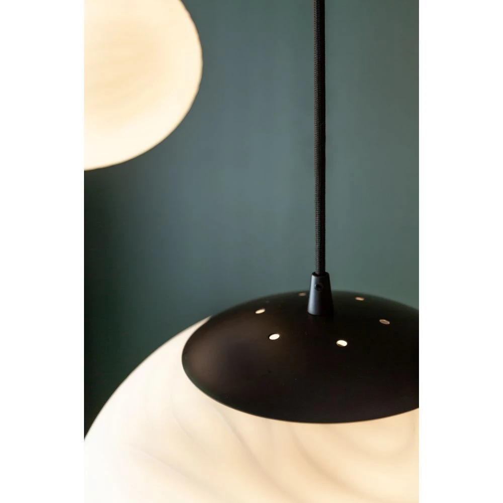 Toppen som er i sortlakeret metal, giver en smuk og moderne overgang i en kontrast til den hvide skærm, hvorfra det sorte tekstilkabel føres op til rosetten som monteres i loftet, som derved afslutter lampen elegant