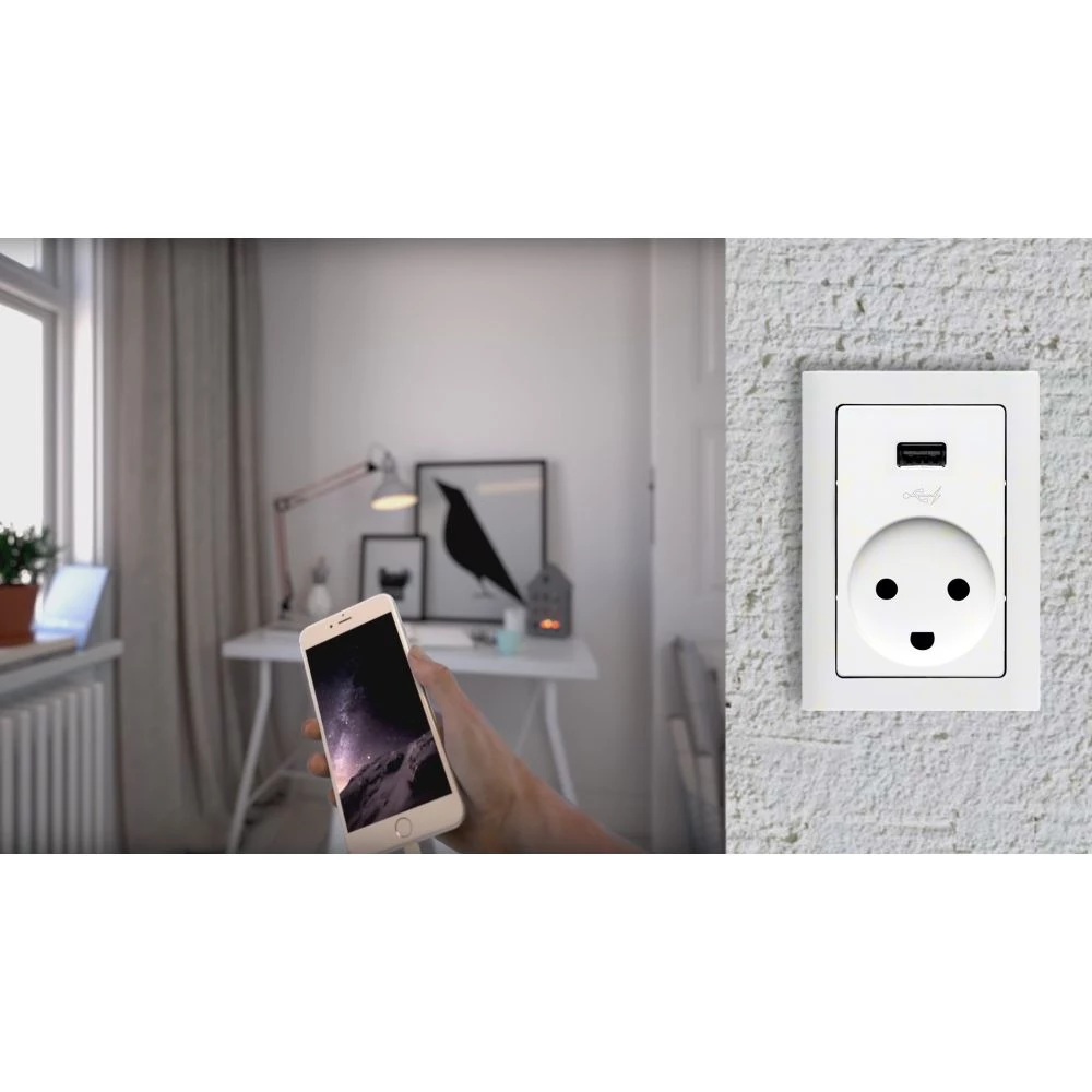 LK FUGA USB ladestrøm er 1A. Kan erstatte en eksisterende 1½M stikkontakt med eller uden jord; Vælg mellem vedlagte afdækninger med eller uden jordhul. Kan monteres i alle FUGA 1½M installationsdåser, underlag eller panelunderlag.