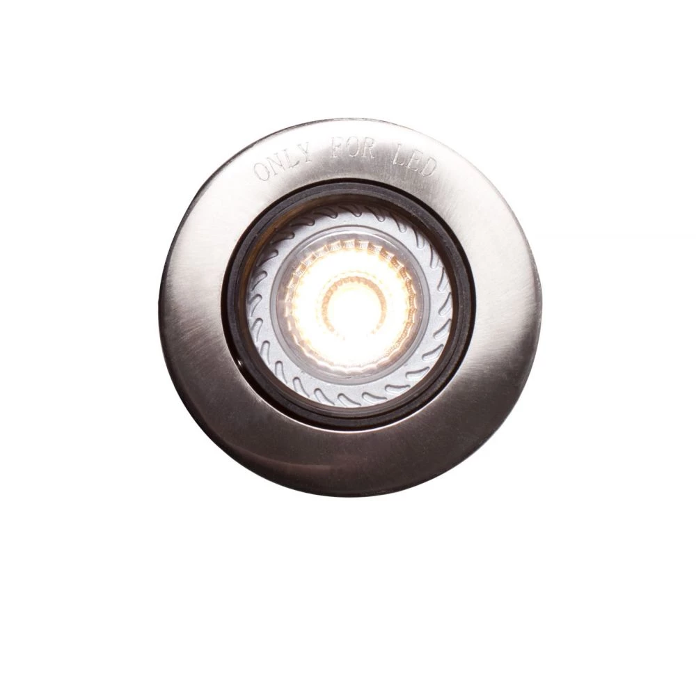 Enkelt indbygningspot med kip og udskiftelig yderring i børstet stål. Inkl. monteringsdåse, ekskl. lyskilder. Egnet til LED-lyskilder.