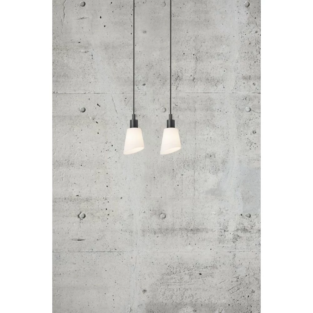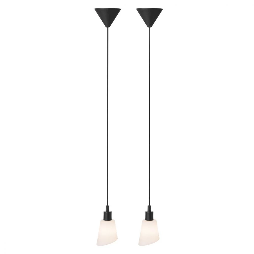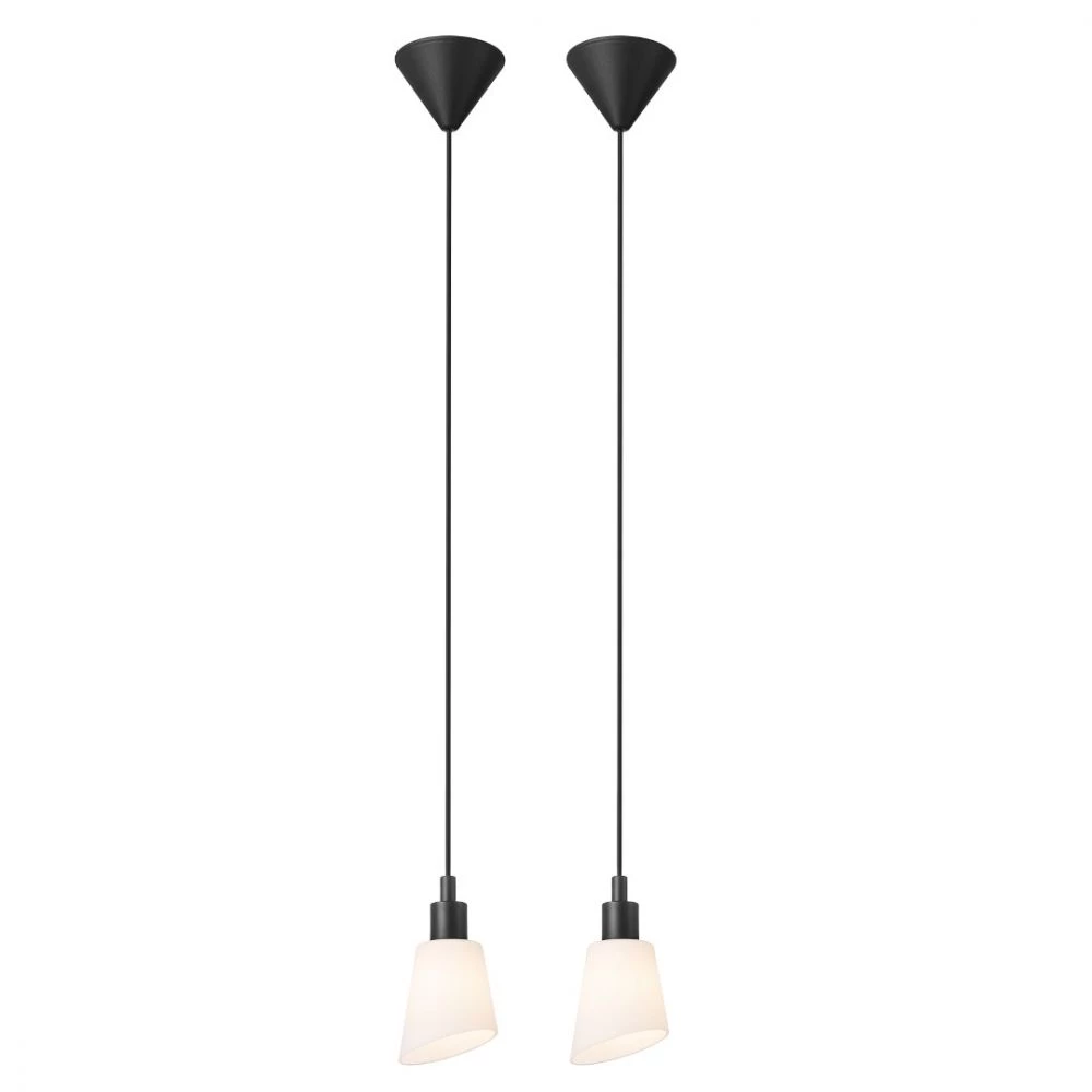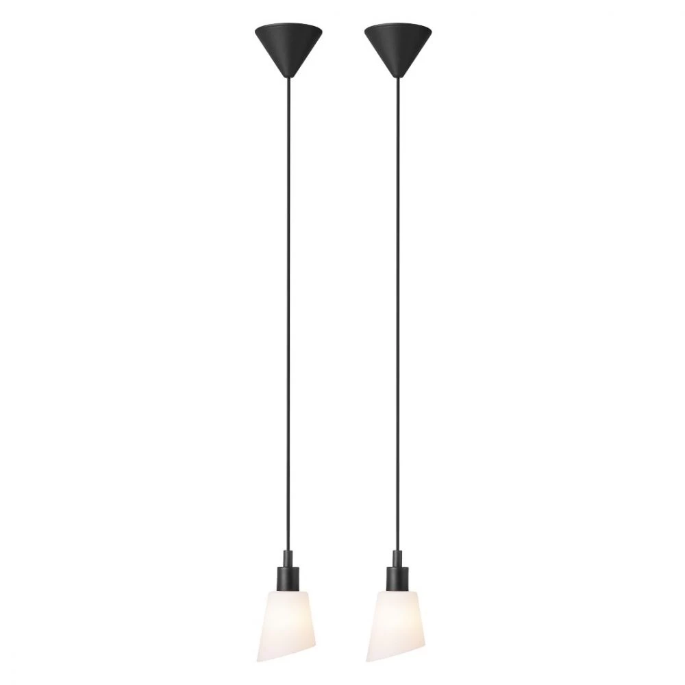 De skrå skærme i mat opalhvidt glas sikrer et behageligt, diffust lys, der er perfekt til hyggelige øjeblikke omkring middagsbordet.