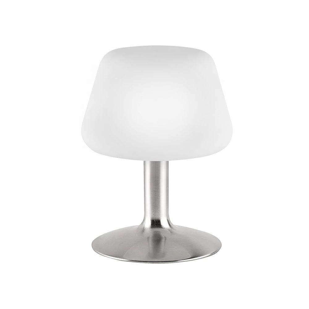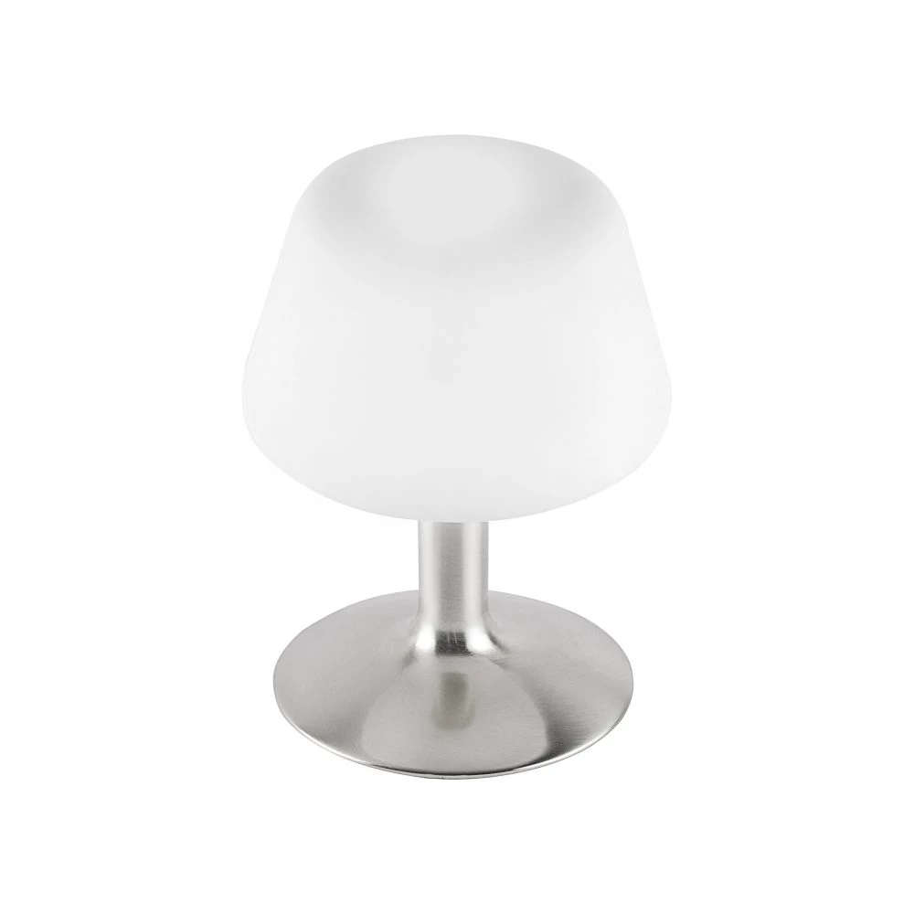 Bordlampen i stål udsender et smukt blændfrit lys takket være sit hvide opalglas