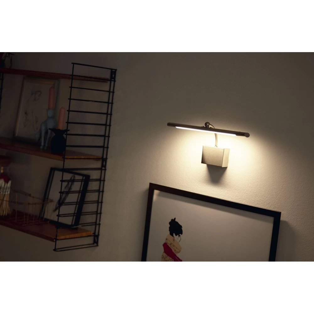 Philips myLiving Mahogany er en stilfuld spejllampe fremstillet i mat akryl med nikkelfinish. Den oplyser dit spejl eller fremhæver dine kunstværker med et varmt hvidt LED-lys.
